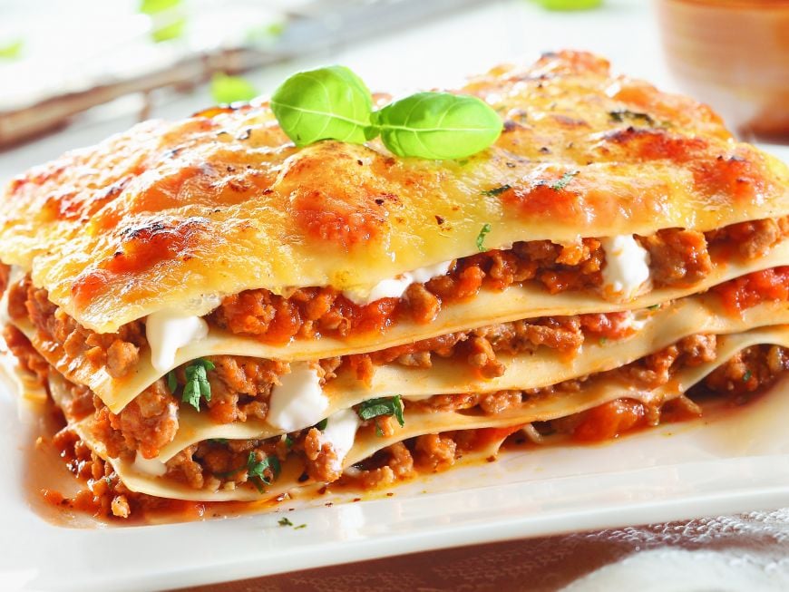 هي عبارة عن طبقات عجينة اللازانيا المليئة بلحم البقر المفروم وصلصة الطماطم الغنية. نضع عليها طبقة من جبنة موزاريلا الذائبة. ثم نقوم بخبزها حتى تصبح القشرة ذهبية ومقرمشة.