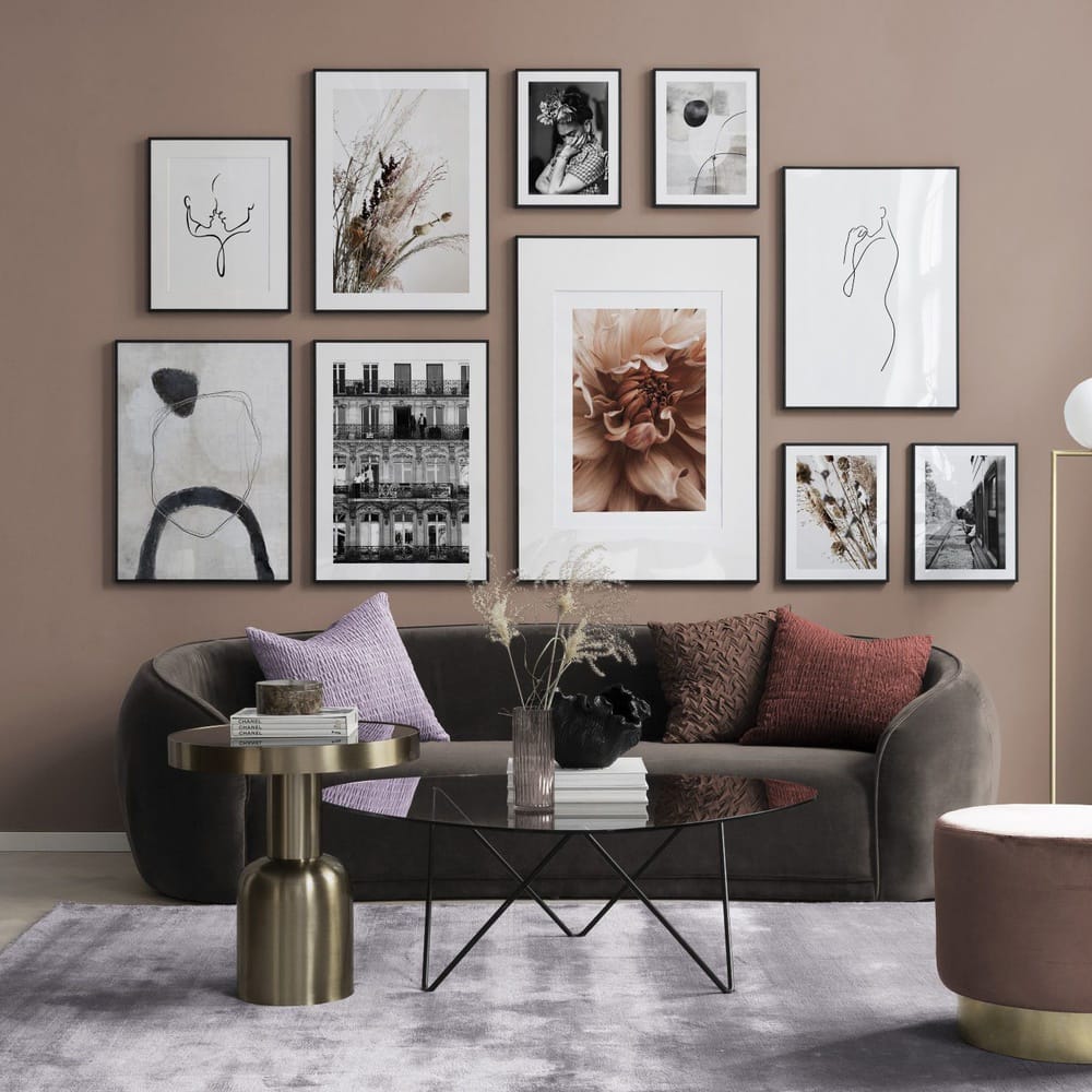 حيث يمكنك ترتيب مجموعة من الصور والإطارات المختلفة الأحجام والأشكال بشكل مميز على الحائط. وذلك لأن هذا التنسيق يوفر لوحة فنية كبيرة تجمع بين الصور الشخصية والأعمال الفنية. مما يضيف جمالية وحيوية للمكان. كما يمكنك اختيار ألوان وبراويز متنوعة تناسب ديكور الغرفة. وذلك يجعل الجدار مركز اهتمام يعكس ذوق صاحب المنزل بشكل مميز وجذاب.